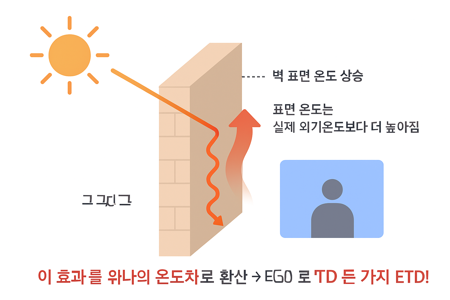 “햇빛 때문에 실제보다 더 뜨거워진 벽을 표현하기 위한 가상의 온도차.”