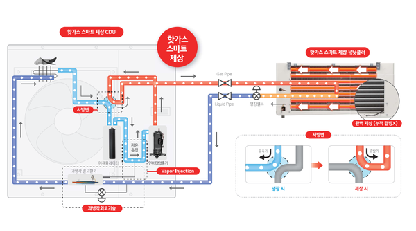 - **압축기에서 막 나온 초고온 냉매 (Hot Gas)**를 일반 운전 경로가 아닌 **별도의 배관(Hot Gas Line)**으로 돌립니다.