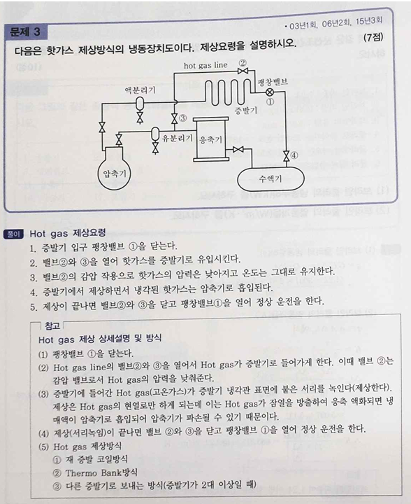 제상 과정에서 증발기에 들어온 핫가스는 증발기 코일을 가열하고 **액화(응축)**됩니다. 하지만 이때 중요한 점은, 핫가스는 서리를 녹이는 과정에서 **잠열(Phase Change Heat)**을 주로 방출하지만, **'재상 된 액체 냉매가 압축기로 흡입되어 파손될 위험'**을 방지하기 위해 장치 설계 시에는 핫가스의 현열만 사용하도록 제어하는 것이 매우 중요합니다. 즉, 증발기에서 핫가스가 완전히 액화되기 전에 제상 사이클을 종료하도록 정교하게 설계합니다. (제공된 그림의 참고 내용을 보시면 더 자세히 알 수 있습니다.)